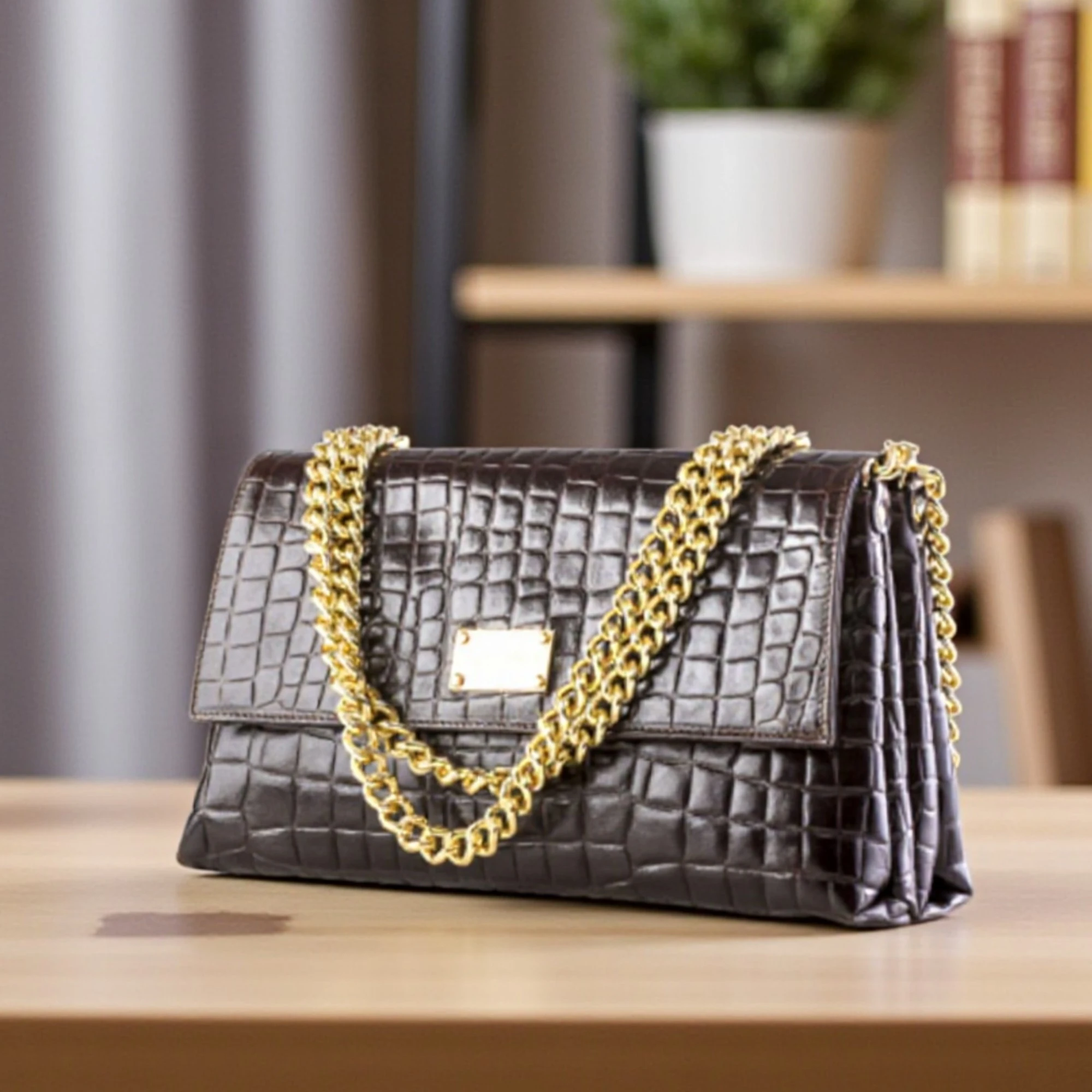 Betty Brown Embossed Crocodile Bag, Large Flap Shoulder Bag
