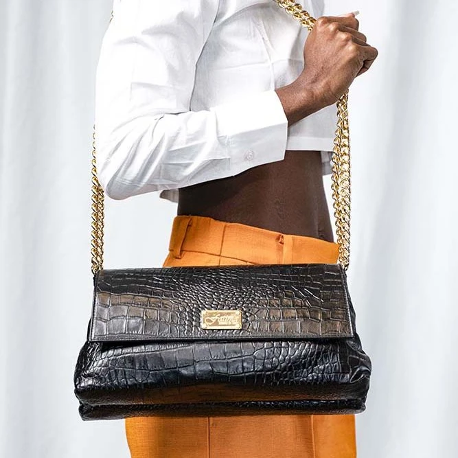 Ivan Troy designs are modern but inspired by classical elements. She Fall in love with exotic skins, along with unique material and accessories, blending African culture and colors with modern. Her luxury handbags and clutches in this collection are handcrafted in Italian local artisans.